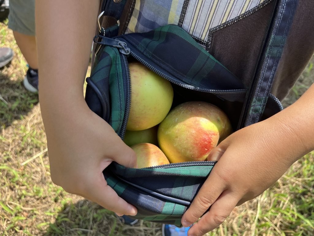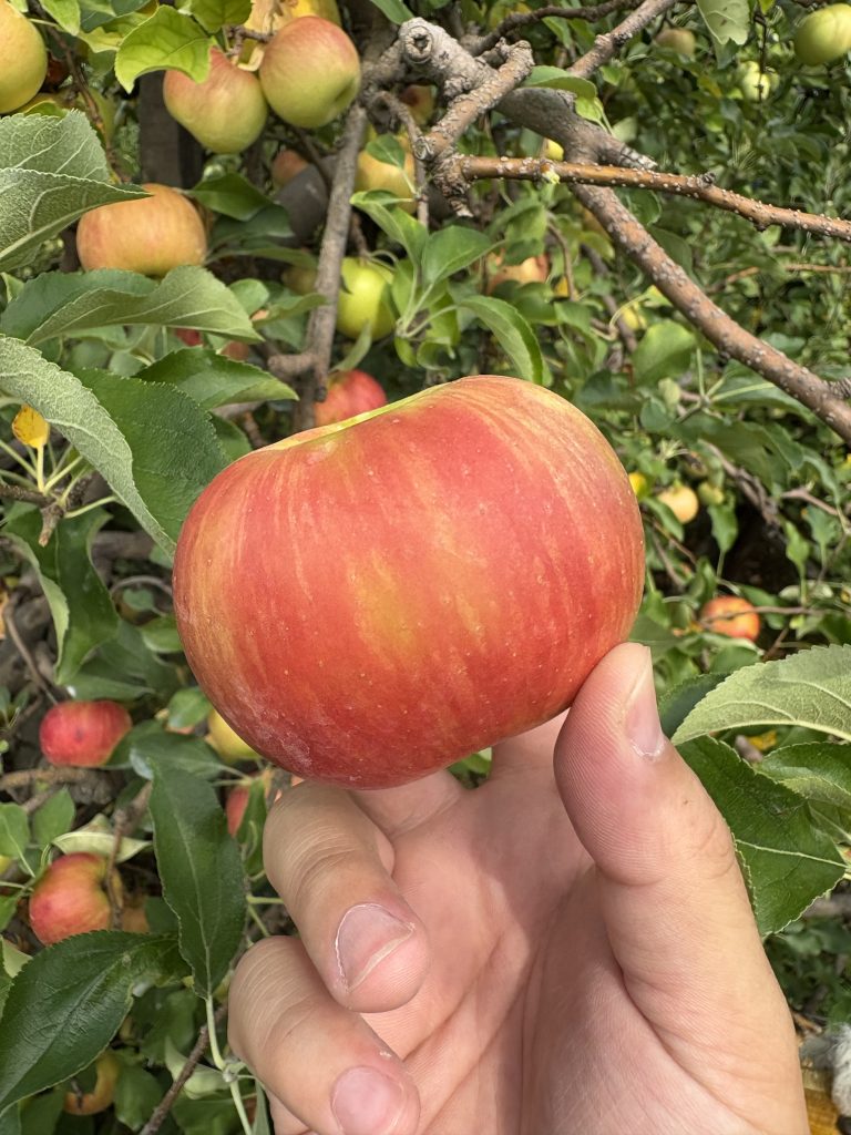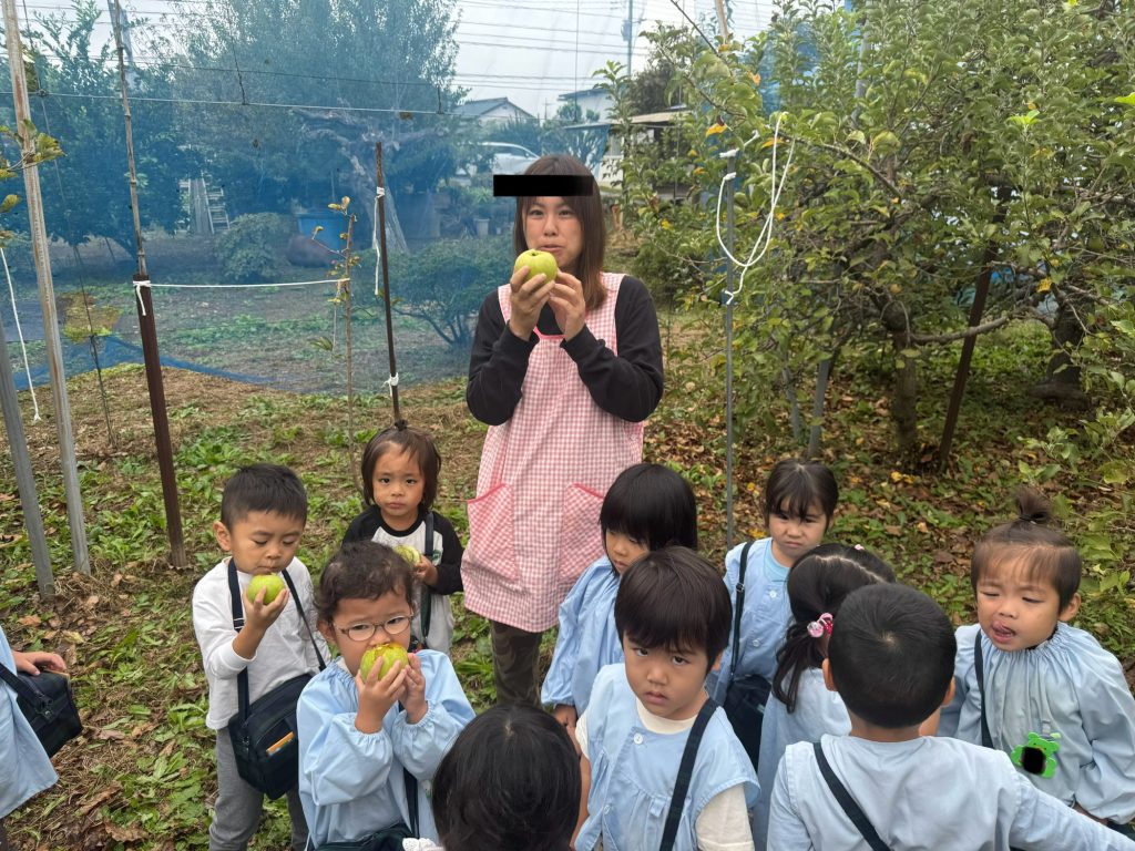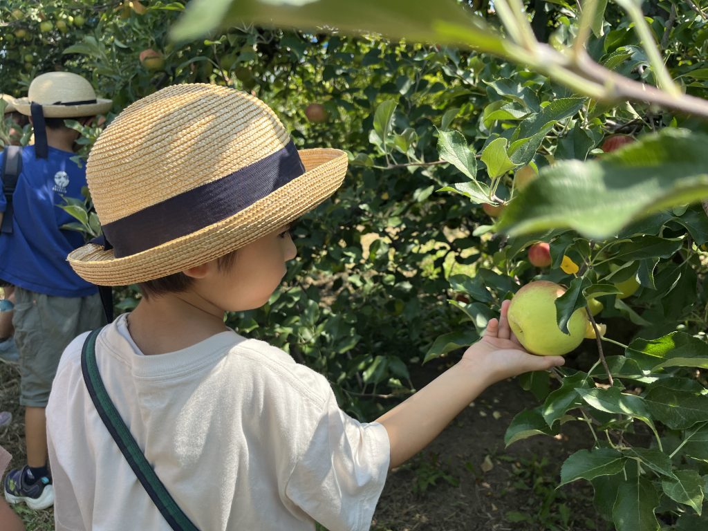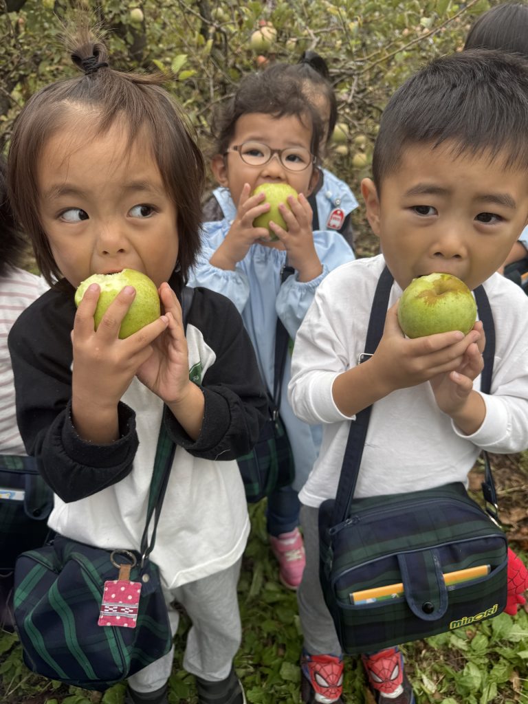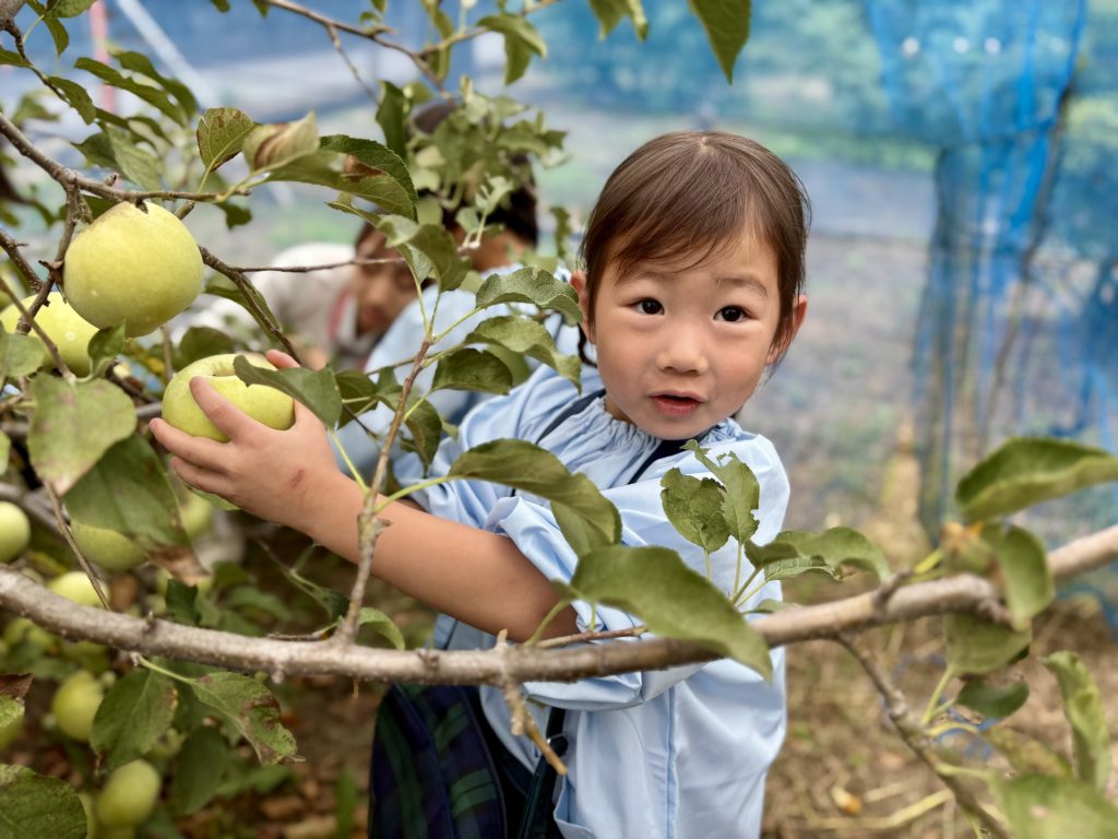 この時期になると子ども達は毎日のようにりんご狩りいき、りんごをとったり、虫を探したり、各々の時間を過ごします。