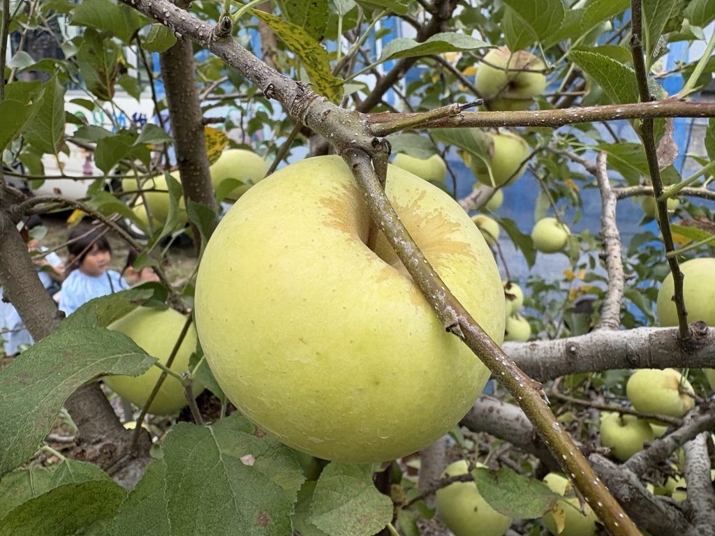 毎年恒例ですが、みのり幼稚園では果樹園があり、多くの品種のりんごの木があります。